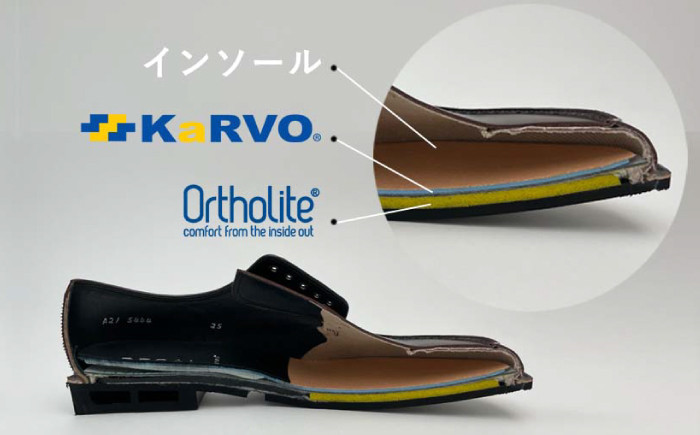 軽量でバネの役割をする新素材『KaRVO(カルボ)』の中底が歩行のパワーアシストをし、更にインソールにオーソライトを使用する事で足のフィット感を高め衝撃を吸収し、通気性、防臭性、抗菌性を高めています。