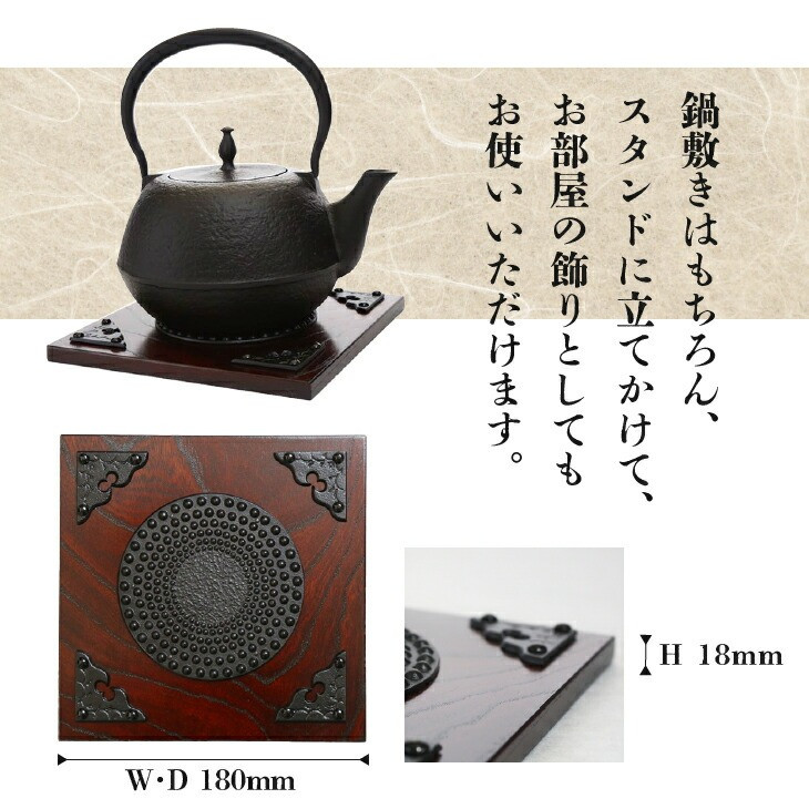 | 容量 | ■名称 鍋敷き ■素材 木部材料:欅化粧合板 金具:鋳鉄 塗装:拭き漆塗り ■サイズ W180×D180×H18mm |