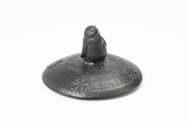 南部型と言われる形の鉄瓶です。本体の表面に雪の結晶模様を施した鉄瓶です。フタの摘みには南極にいるペンギンをデザインを施しています。