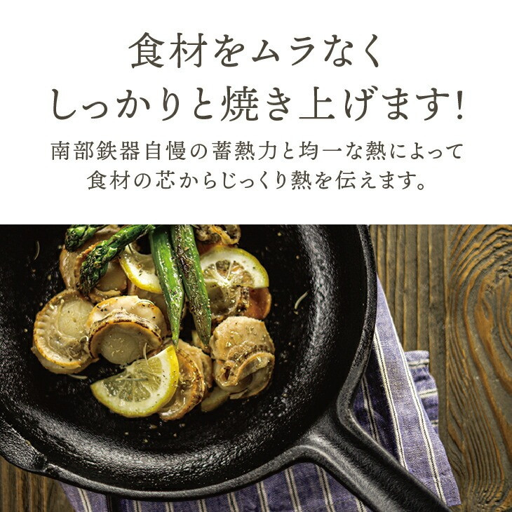 こちらのフライパンは南部鉄器独自の特徴として、蓄熱力と均一に広がる熱によって、食材をムラなくしっかり焼き上げることができます。ぜひ末永くご愛用いただければ幸いです。