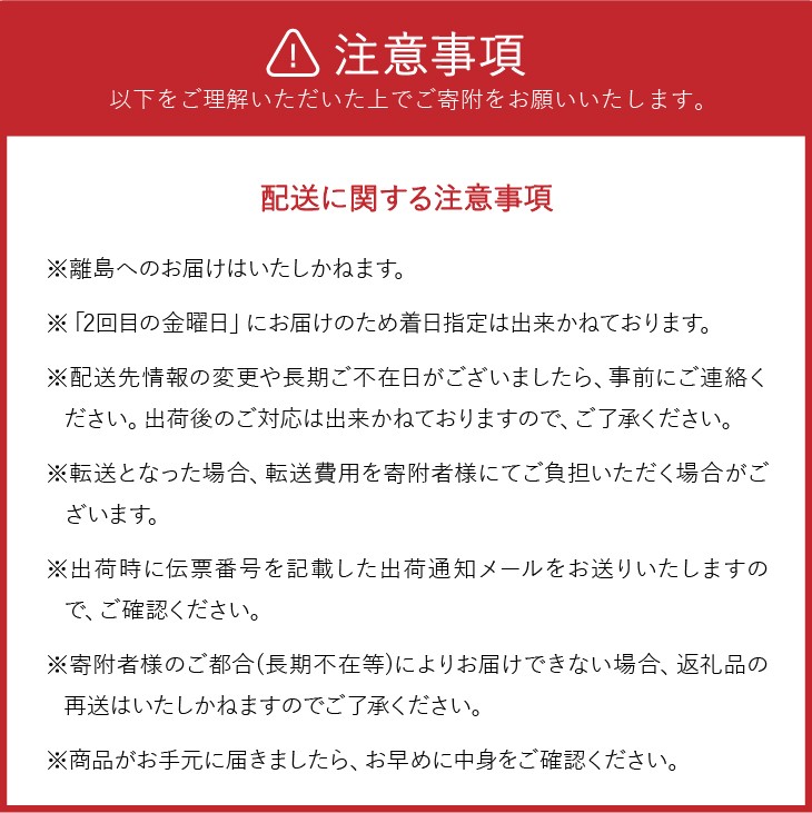 ※寄附者様のご都合(長期不在等)によりお届けできない場合、返礼品の再送はいたしかねますのでご了承ください。