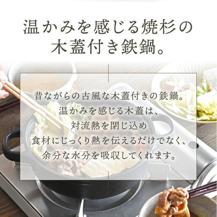 昔ながらの古風な木蓋付きの鉄鍋。温かみを感じる木蓋は、対流熱を閉じ込め食材にじっくり熱を伝えるだけでなく、余分な水分を吸収してくれます。