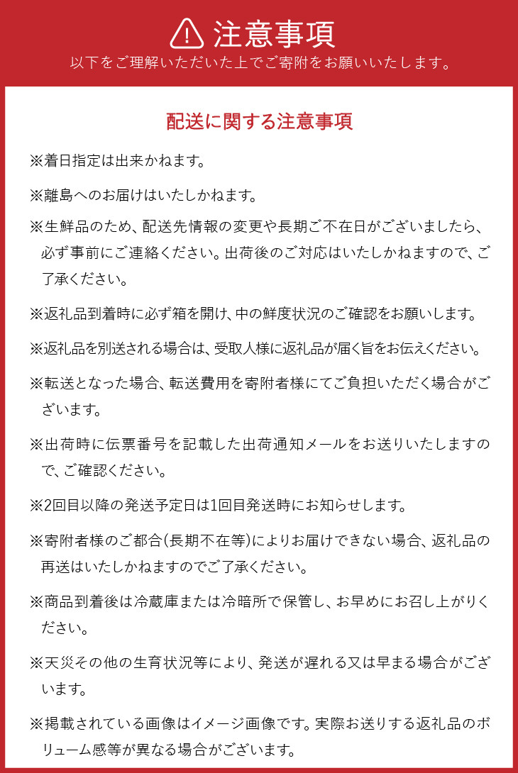※生鮮品のため、配送先情報の変更や長期ご不在日がございましたら、必ず事前にご連絡ください。