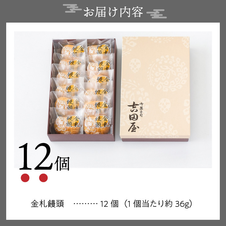 | 容量 | ■名称 吉田屋の看板商品 金札饅頭 ■内容量 12個入 ■原材料 小麦粉、砂糖、卵、バター、練乳、白あん、膨張剤 |