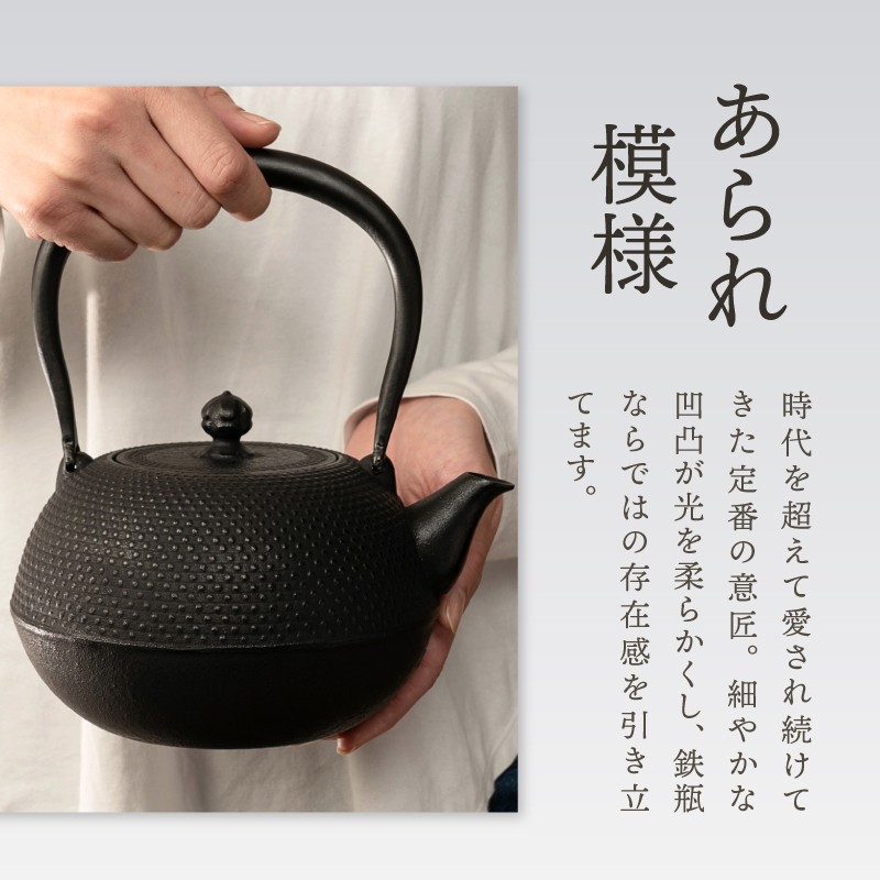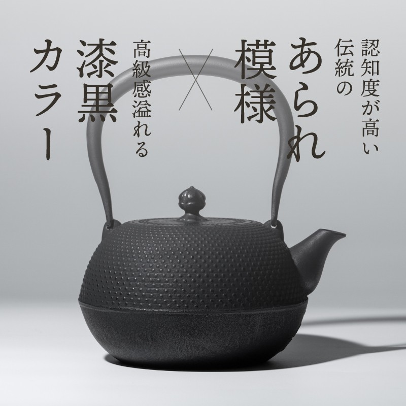 認知度が高い伝統の「あられ模様」と高級感の溢れる「漆黒」カラーの鉄瓶です。