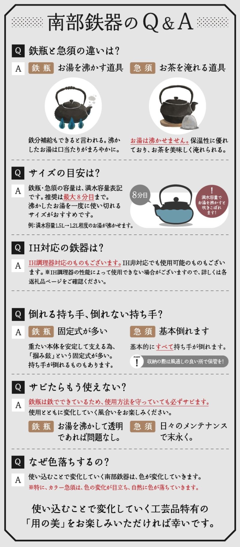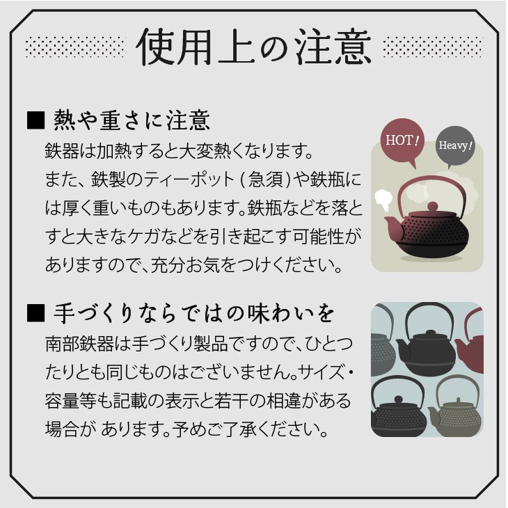 また、鉄瓶の取り扱い方法が動画でも見られるわかりやすい説明書付きです。