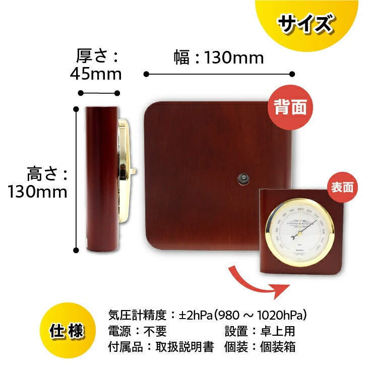 | 容量 | ■名称 カスタム気圧計 ■内容量 気圧計×1台 ■選べるカラー 全2色 ・ホワイト BM-610 ・ブラック BM-620 ■サイズ 寸法:130×130×45mm 重量:350g ■材質 主な材質:天然木 ■仕様 気圧計精度:±2hPa(980~1020hPa) 電源:不要 設置:卓上用 付属品:取扱説明書 個装:個装箱 |