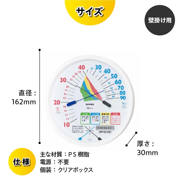 温度計、湿度計指針の交差点で熱中症注意目安となる4段階の暑さ指数参考値(WBGT値参考値)を表示します。「注意」「警戒」「厳重警戒」「危険」の4段階。アナログ式ですので、電池不要で計測します。壁掛け用。