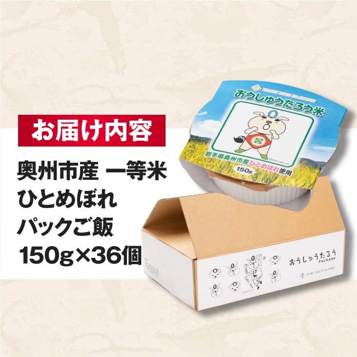 こだわり農家HARURICE パックライス 岩手県奥州市産お米 おうしゅうたろうpackage ひとめぼれ 一等米 150g×36個 レンジ 簡単 便利 一人暮らし 保存食 備蓄 非常食 防災 奥州市公式マスコットキャラクター ご当地キャラ ゆるキャラ 常温配送