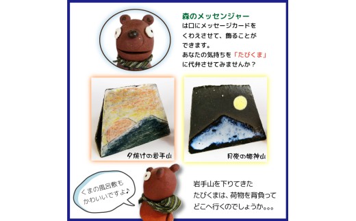 長内工房が作る「森のメッセンジャー」、愛嬌抜群の人形をお送りします 森のメッセンジャー たびくまと夕焼けの岩手山&月夜の姫神山セット【長内工房】 / くま 置物 インテリア メッセージ
