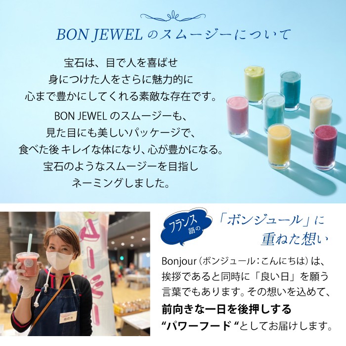 「ボンジュエル」という響きは、フランス語の「ボンジュール(意味:こんにちは)」とも重ねられ、挨拶の他に「良い日」を意味しており、BON JEWELのスムージーは前向きな一日を過ごすためのパワーフードとしての意味も持つ商品となります。