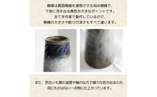 模様は異国情緒を連想させる刻み模様で、下地に浮き出る青色が大きなポイントです。