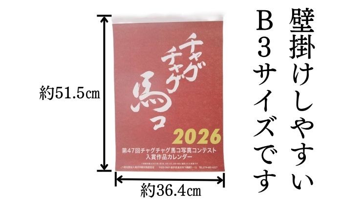 | 容量 | 「第47回チャグチャグ馬コ写真コンテスト 入賞作品カレンダー2026」×1点 ・サイズ:B3(横 364mm×縦 515mm) ・壁掛けタイプ |