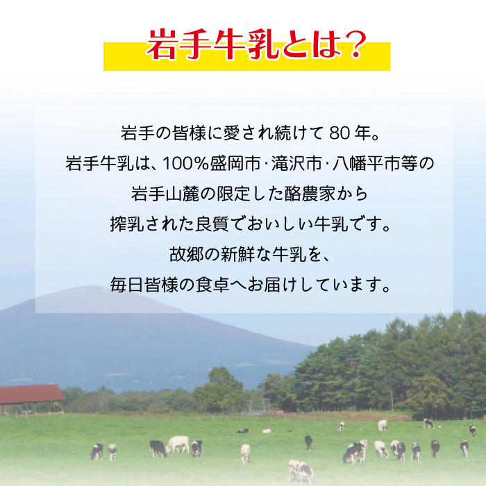 岩手の皆様に愛され続けて80年。岩手牛乳は、100%盛岡市・滝沢市・八幡平市等の岩手山麓の限定した酪農家から搾乳された良質でおいしい牛乳です。