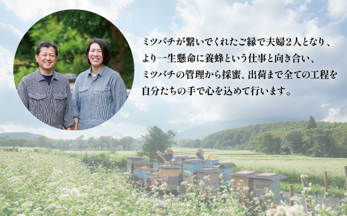 ミツバチが繋いでくれたご縁で夫婦2人となり、より一生懸命に養蜂という仕事と向き合い、ミツバチの管理から採蜜、出荷まで全ての工程を自分たちの手で心を込めて行います。