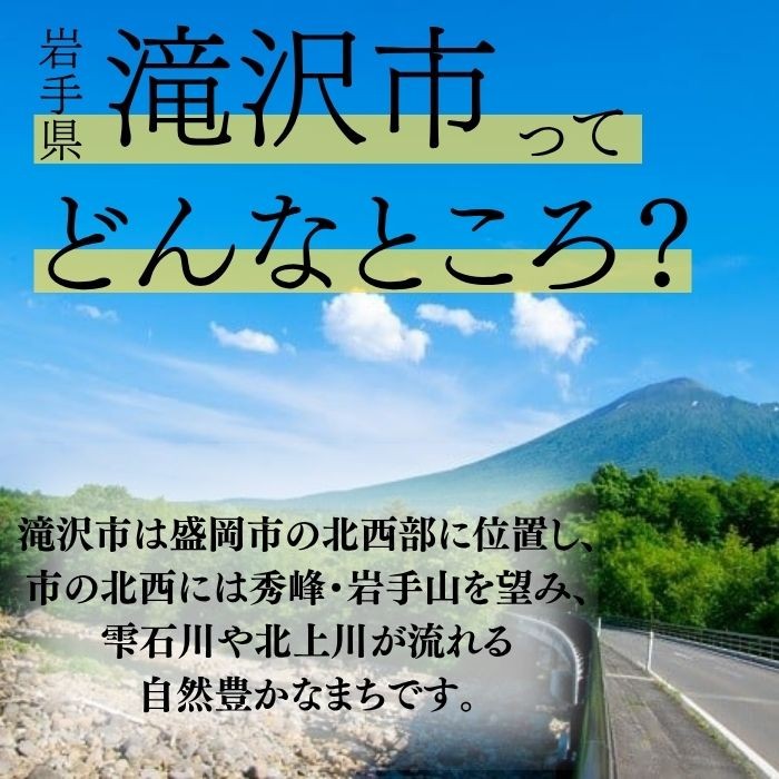 岩手県盛岡市の北西部に位置する滝沢市は、北西部を秀峰・岩手山に、市域を雫石川と北上川が流れる自然豊かな地域で、スイカ、リンゴ、岩魚、サツマイモと岩手山の麓で何年もの年月をかけて磨かれた清らかな伏流水は、滝沢においしい自然の恵みをもたらしてくれます。