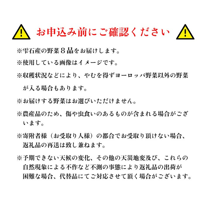 | 容量 | ヨーロッパ野菜 8品 【お申込み前にご確認ください】 ※収穫状況などにより、やむを得ずヨーロッパ野菜以外の野菜が入る場合もあります。 ※お届けする野菜の種類はお選びいただけません。 ※農産品のため、傷や虫食いのあるものが含まれる場合もございます。ご了承ください。 ※寄附者様(お受取り人様)の都合でお受け取りいただけない場合、返礼品の再送は致し兼ねます。 ※予期できない天候の変化、その他天災地変及び、これらの自然現象による不作など不測の事態により返礼品の出荷が困難な場合は、代替品にて対応させていただきます。 |