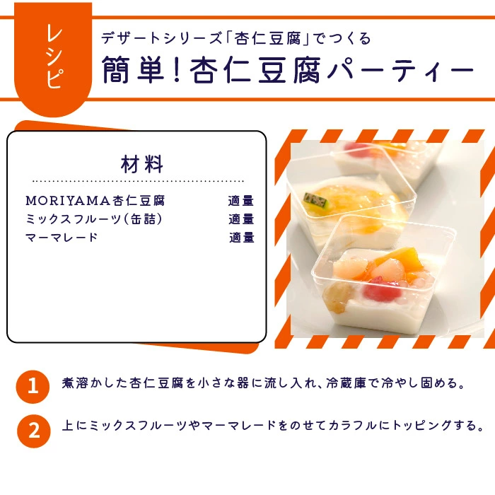 杏仁豆腐・マンゴープリンは冷やしてそのまま盛り付けるもよし、くずして滑らかにしとろとろの状態で食べるのもよし、温めて溶かして好きな型に流し固めて食べてもよし