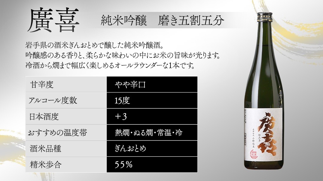 味わい・特徴:岩手県産吟ぎんがを100%使用した純米大吟醸酒です。甘口ですが後味がさっぱりしているのが特徴です。冷やしてお飲みください。