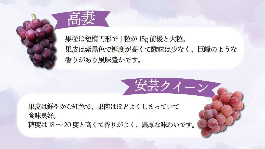 シャインマスカット、安芸クイーン、クイーンニーナ、ロザリオロッソ、ピオーネ、高妻、藤稔