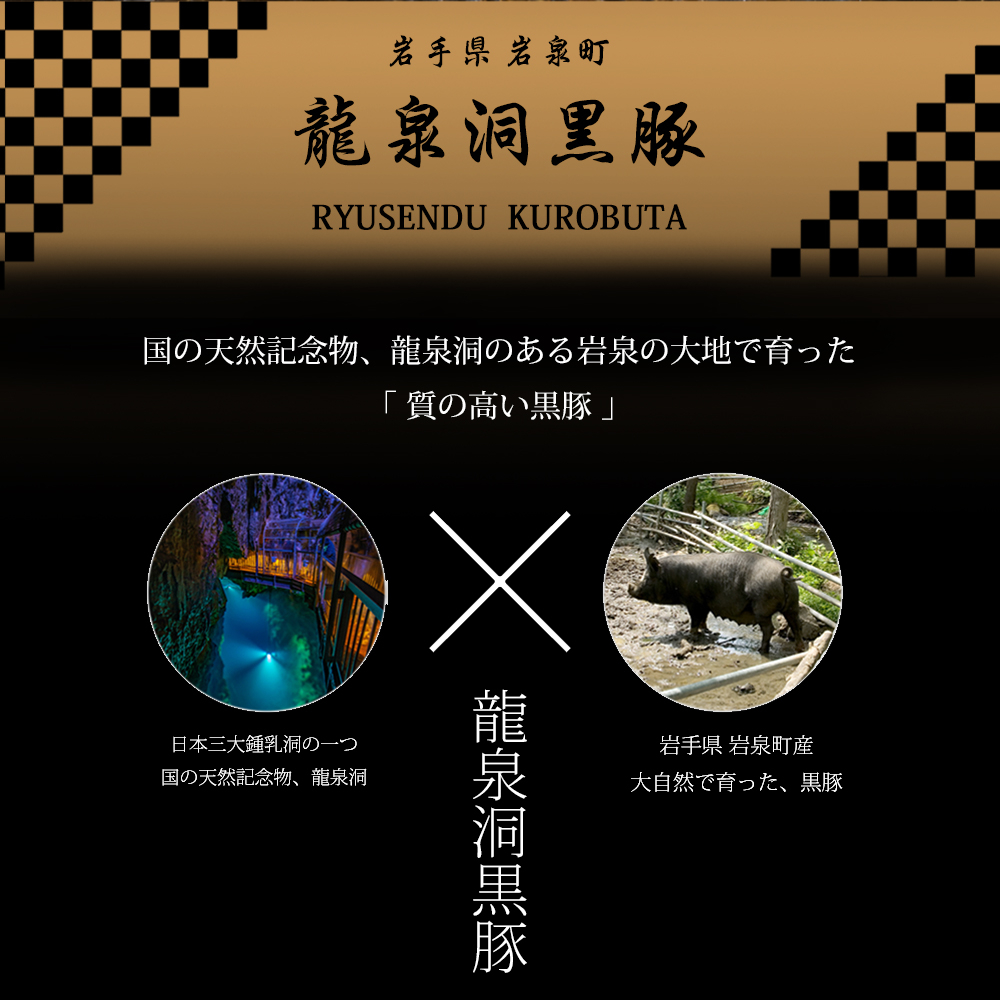 国の天然記念物「龍泉洞」のある岩泉の大地で育った質の高い黒豚です。龍泉洞黒豚のこだわりは、育成豚を放牧したくさん遊び足腰を鍛え、強い身体にしてから種豚として育てることです。岩手県岩泉町、この地域は豊かな自然環境である一方、厳かな自然という一面もあります。そんな中でも豚にとって適した環境を整えることで、強くたくましい健康な豚に育ちます。