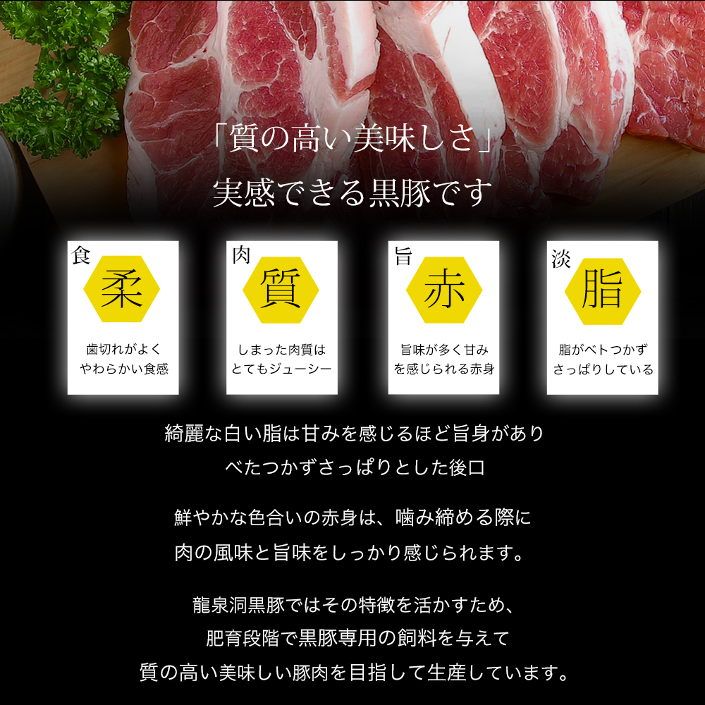 綺麗な白い脂は甘みを感じるほど旨味があり、ベタつかずさっぱりとした後口、鮮やかな色合いの赤身は、噛み締める際に肉の風味と旨味をしっかりと感じれます。龍泉洞黒豚はその特徴を活かすため、肥育段階で黒豚専用の飼料を与えて、質の高い美味しい豚肉を目指して生産しています。