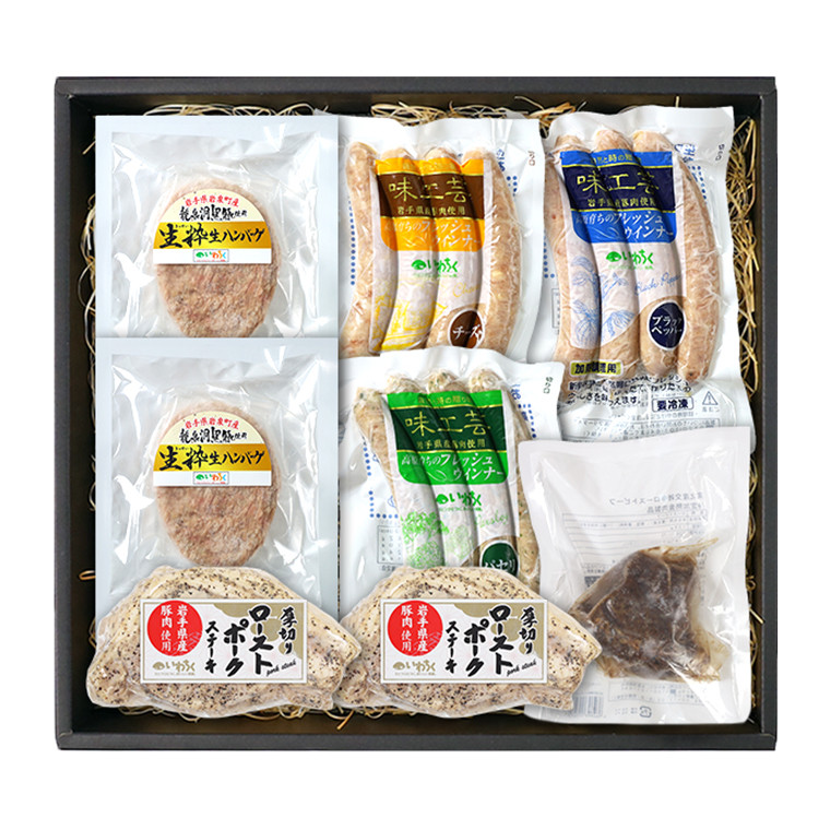 | 容量 | 加工肉 6種 8品 詰め合わせセット ・生ウインナー(ブラックペッパー)144g×1 ・生ウインナー(チーズ)144g×1 ・生ウインナー(パセリ)144g×1 ・龍泉洞黒豚使用 生粋 生ハンバーグ 150g ×2 ・東北産 交雑牛ローストビーフ 135g ×1 ・厚切り ローストポーク 200g ×2 |