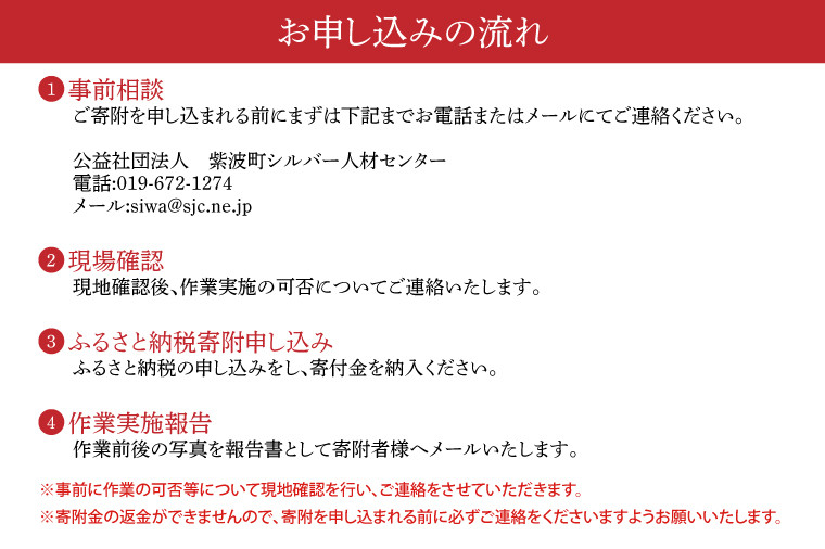 ※寄附を申し込まれる前に 公益社団法人 紫波町シルバー人材センター(電話:019-672-1274、メール:siwa@sjc.ne.jp)まで必ずご連絡をお願いいたします。
