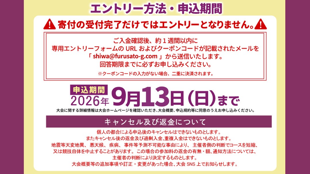 | 申込期日 | 【寄附申込期日】2026年9月6日(日)ご入金確認分まで ※定員に達した場合は、申込期限前であっても申込を締め切らせていただきます。 【エントリー申込期日】2026年9月13日(日)まで ※専用のエントリーフォームより上記期日までにお申し込みください。 |