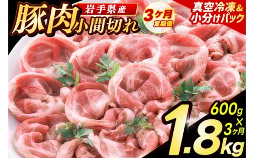 300gの小分けで使いやすい!岩手県産豚肉をお楽しみいただけます♪ \3ヶ月連続 定期便/【岩手県産豚肉】小間切れ600g (300g×2パック) (総計 1.8kg) 大容量 肉 冷凍 小分け 肉じゃが しょうが焼き お弁当 おかず 岩手 いわちく 紫波町(AB135)