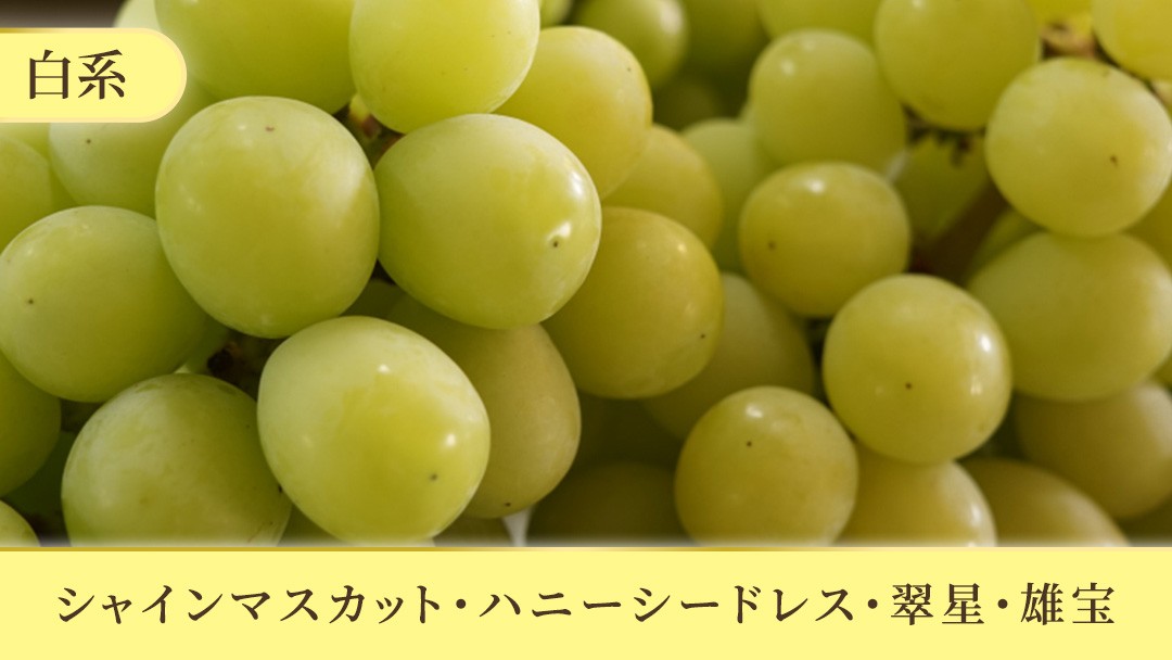 ※白系(シャインマスカット、ハニーシードレス、翠星、雄宝)、黒系(藤稔、ナガノパープル、BKシードレス、ブラックビート)、赤系(クイーンニーナ、ジャスミン、甲斐乙女、サニードルチェ)等からお届けします。