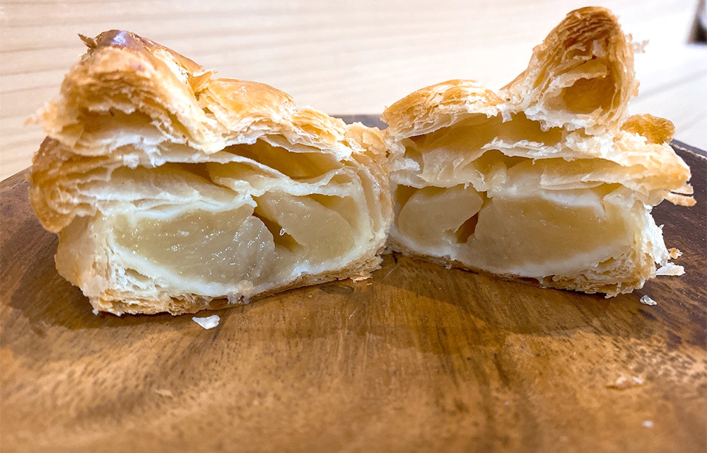 県産小麦100%を使用した北海道バター香るこだわりの生地に、甘く煮込んだ地元のりんご(紅玉)をたっぷり包み込んで焼き上げました。