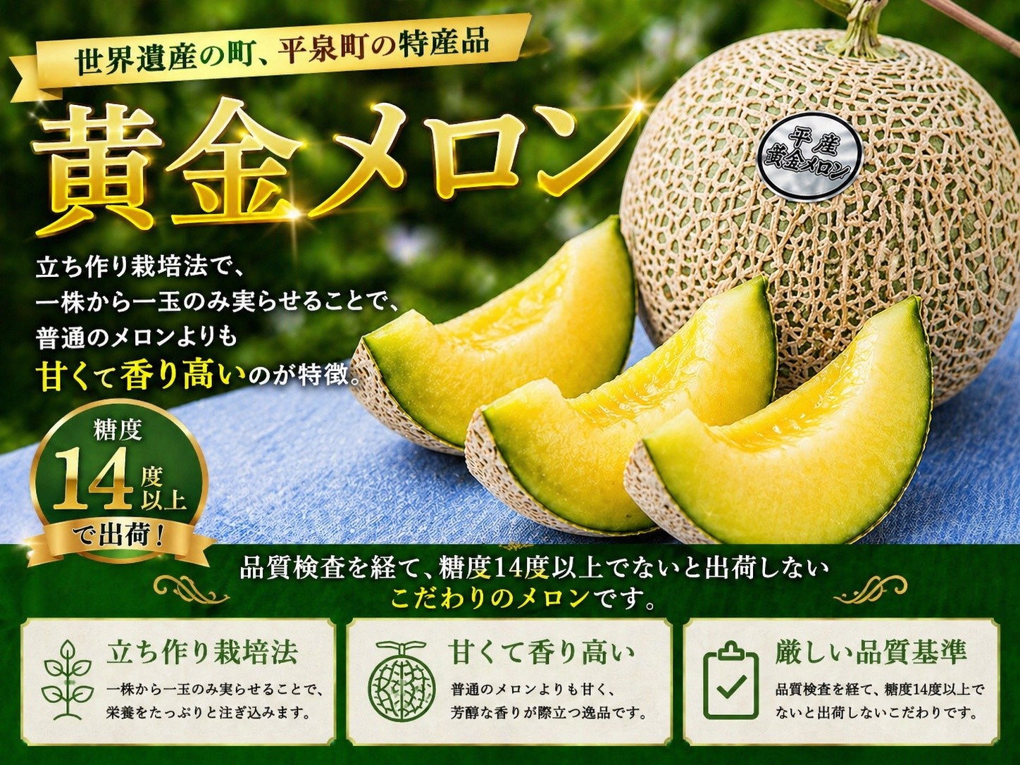 糖度14度以上!甘くてジューシーな平泉の特産品 【令和8年度分予約受付】平泉黄金メロン 2玉 Lサイズ 合計約3kg 【2026年8月下旬以降より発送】/ メロン マスクメロン 果物 くだもの フルーツ 甘い 旬 産地直送 予約 先行予約