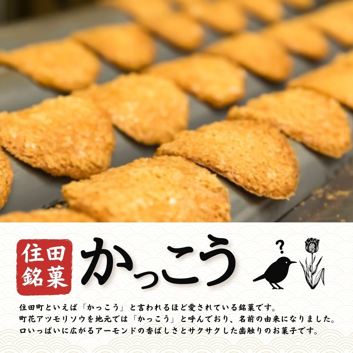 住田町といえば「かっこう」と言われるほど愛されている銘菓です。町花「アツモリソウ」を地元では「かっこう」と呼んでおり、口いっぱいに広がるアーモンドの香ばしさとサクサクした歯触りのお菓子です。