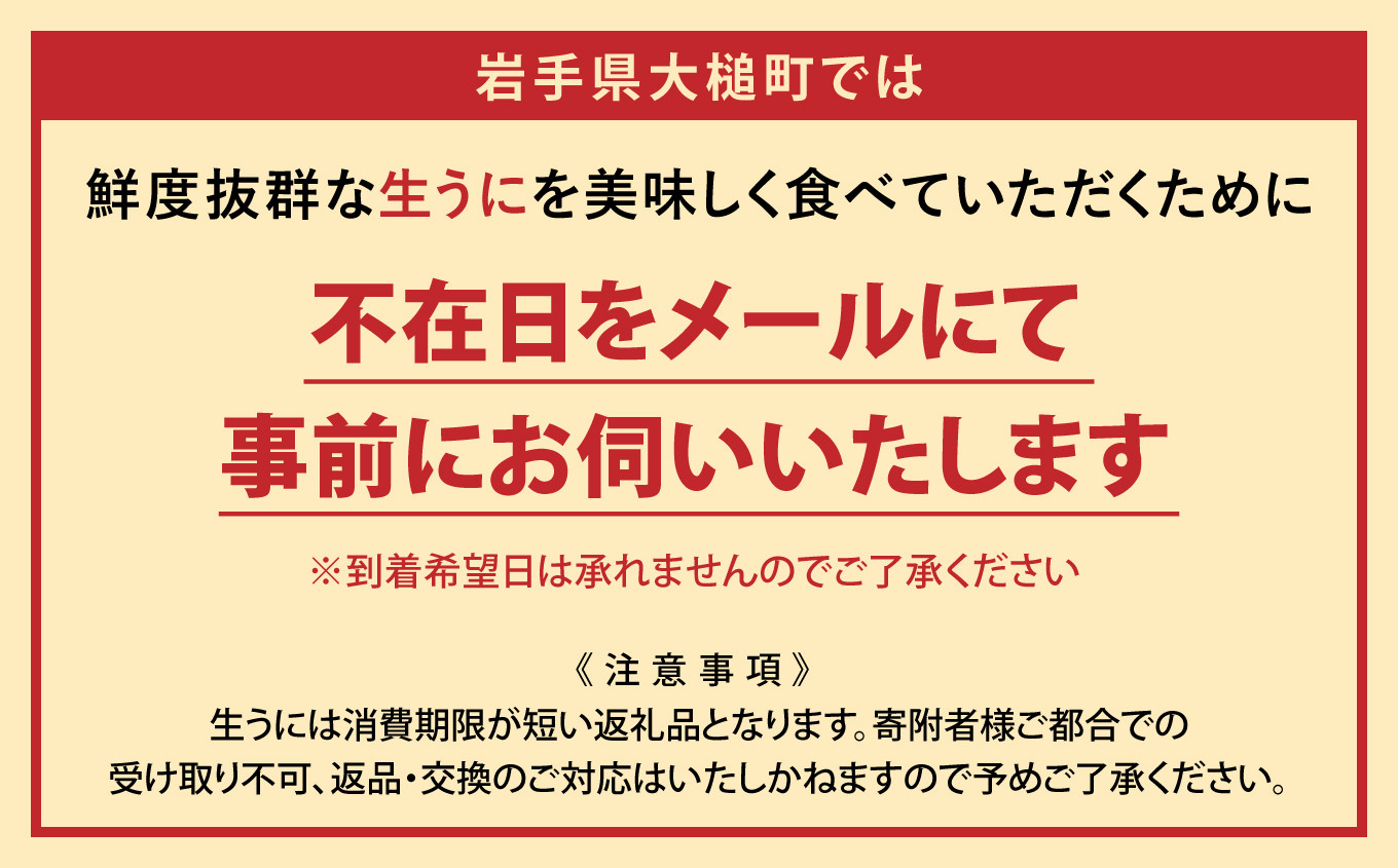 ●うには漁獲できる日が限られており、天候等の事情により入荷できない場合がございます。発送の目途が立った段階で、お申し込みいただいた順に発送時期お知らせメールを送信いたします。