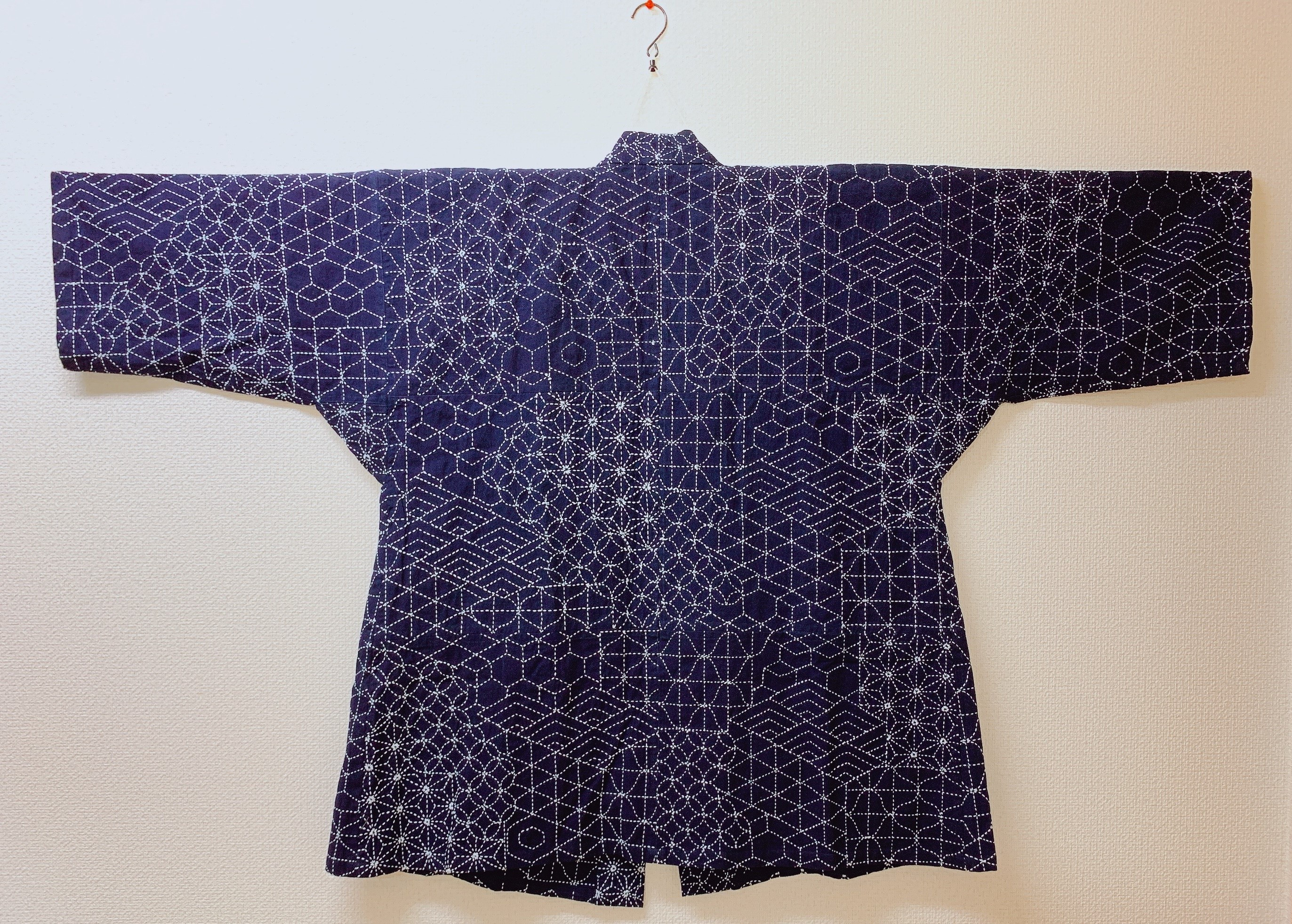 藍染の生地に生成りの刺し子糸で仕上げた野良着