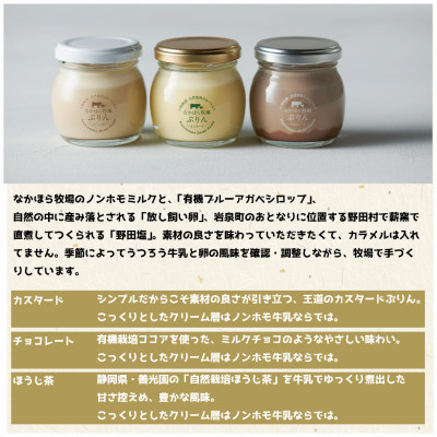 なかほら牧場のプリンには、昼夜自然放牧で育まれたなかほら牧場の牛乳と、同じくストレスフリーな放し飼いで飼育された卵を使いました。あえてカラメルシロップは入れずに卵と牛乳の幸せな味を優しく支えるブルーアガベシロップで甘みを加えています。毎週一つ一つ丁寧に手づくり。百貨店のお中元・お歳暮ギフトにも選ばれるなめらかぷりんの贅沢な味わいをお楽しみください。