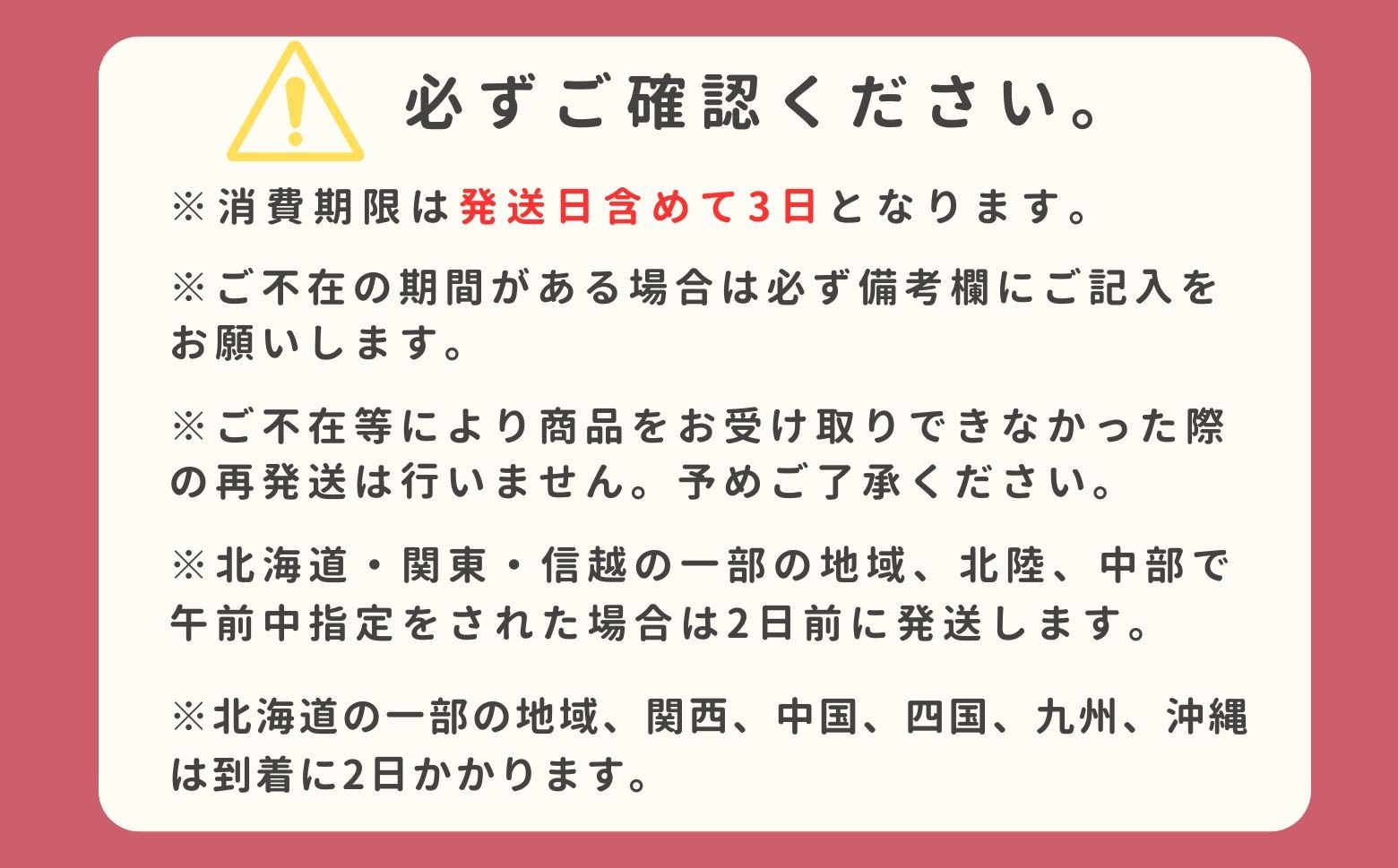 ※お申込み順に順次発送いたします。配送日指定はできません。 ※生ものですので、ご不在の期間がある場合は必ず備考欄にご記入をお願いします。 ※発送時に出荷通知メールをお送りします。 ※ご不在等により商品をお受け取りできなかった際の再発送は行いません。予めご了承ください。 ※離島へのお届けはできません。 |