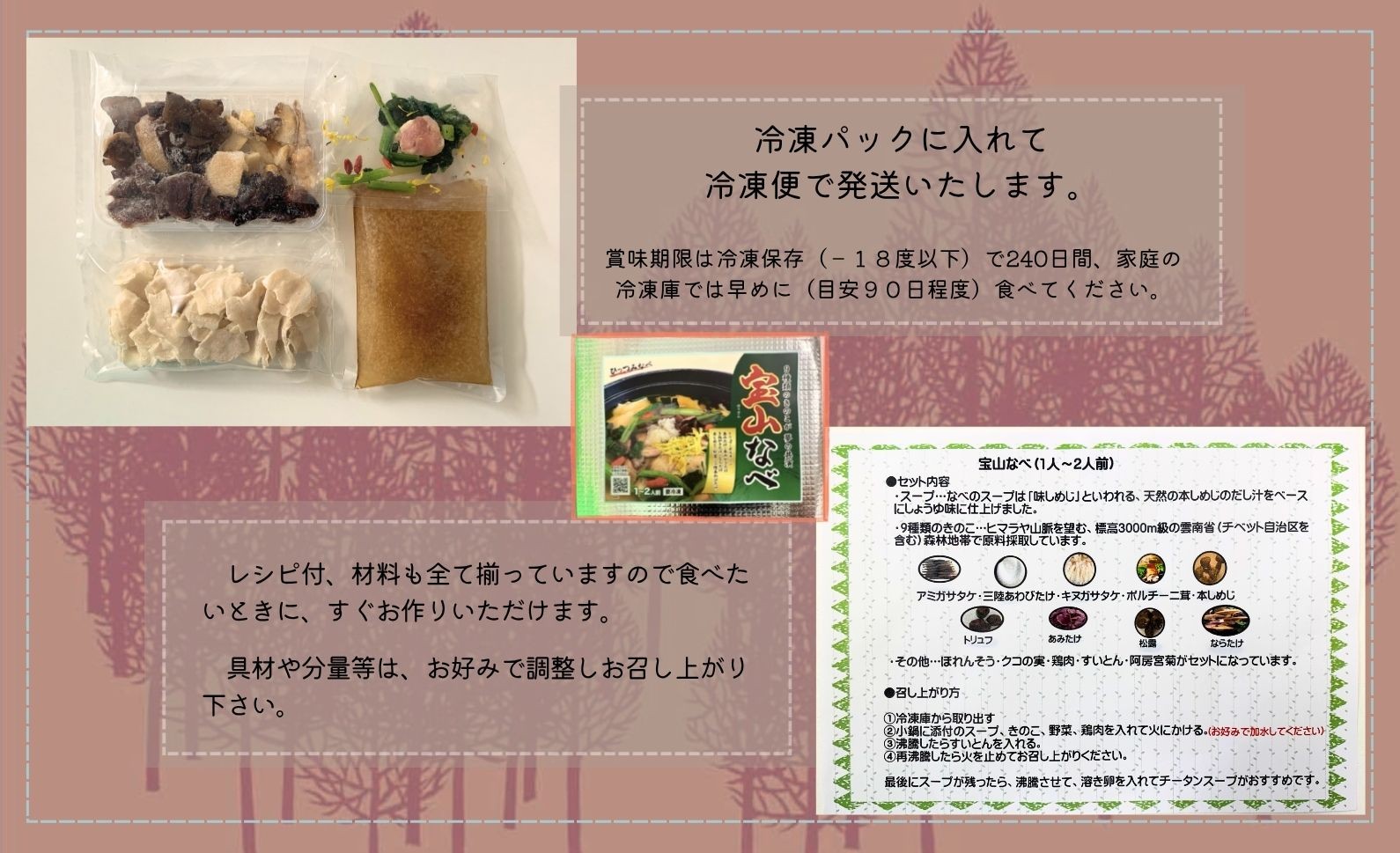 | 容量 | 【特産品番号423】 宝山なべ 1~2人前 630g 天然本しめじの出汁をベースにしたタレと9種類のキノコ、すいとんを使ったお鍋です。 |