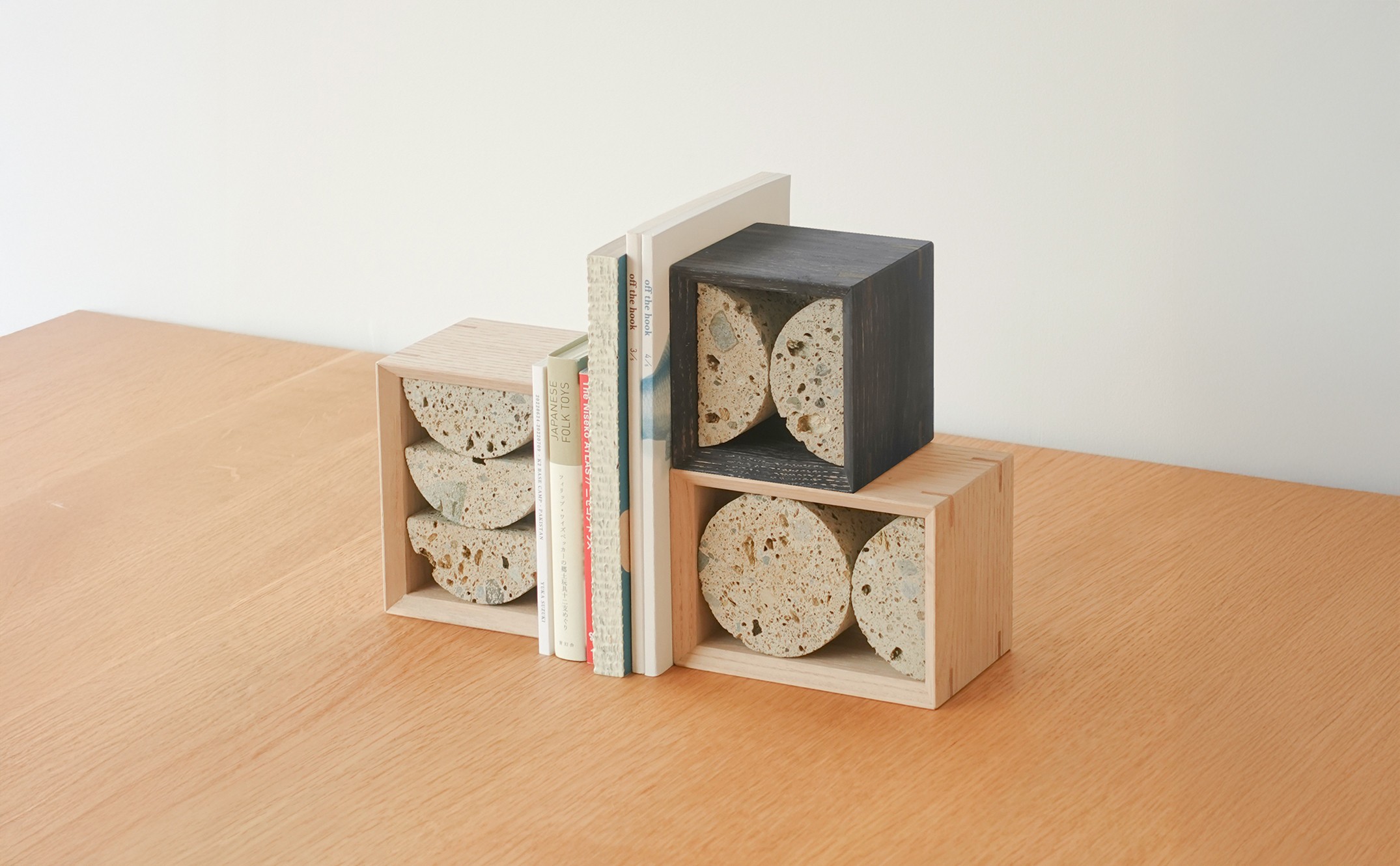 国産広葉樹と地域素材に焦点を当てたものづくりを通して、国産広葉樹の有効活用と地域素材の生産背景を伝える「SENDAI FORME(センダイフォルム)」が手がける、重みを活かした小ぶりながらも安定感のあるブックエンドは、秋保石の特徴を活かしながらフレームとなるクリ材が秋保石のゴツゴツした石肌から大切な家具を守ってくれるデザインです。