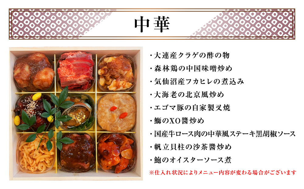 | 容量 | 和・洋・中 計三段 各8寸(24cm×24cm)×1セット ※献立は下記をご覧下さい。 ※仕入れ状況によりメニュー内容が変わる場合がございます。 |