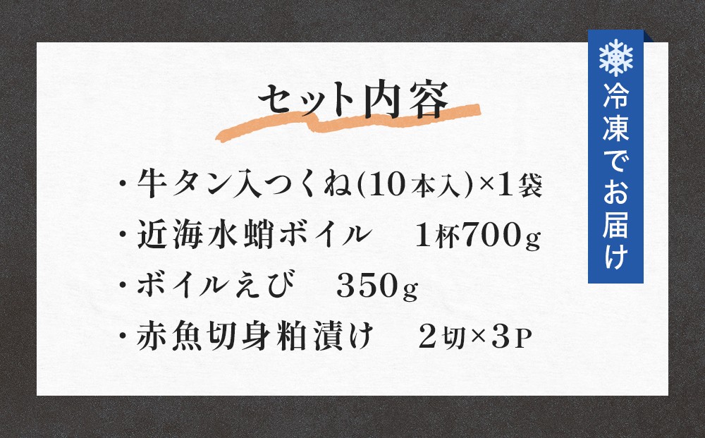 | 消費期限 | 【賞味期限】 牛タン入つくね:製造日から2年 近海水蛸ボイル:冷凍180日 ボイルえび:冷凍90日 切身粕漬け:冷凍180日 |