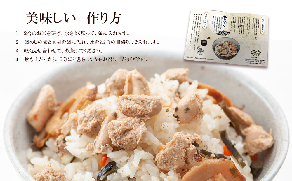 〈石巻金華釜めし〉2合のお米を研ぎ、水をよく切って釜に入れます。釜めしの素と具材を釜に入れ、水を2.2合の目盛りまで入れます。軽く混ぜ合わせて炊飯してください。炊き上がったら、5分ほど蒸らしてからお召し上がりください。
