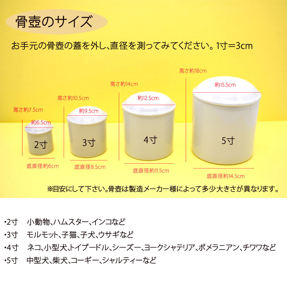 | 容量 | 【ご希望のサイズとカラーを種類からお選びください】 骨壷カバー×1 ※お届けはカバーのみとなります。骨壺は含まれません。 角型、筒型お好みでタイプをお選び頂けます。 ご希望を備考欄にご記入ください。 備考欄にご記入が無い場合は、筒型をお送りさせていただきます。予めご了承ください。 |