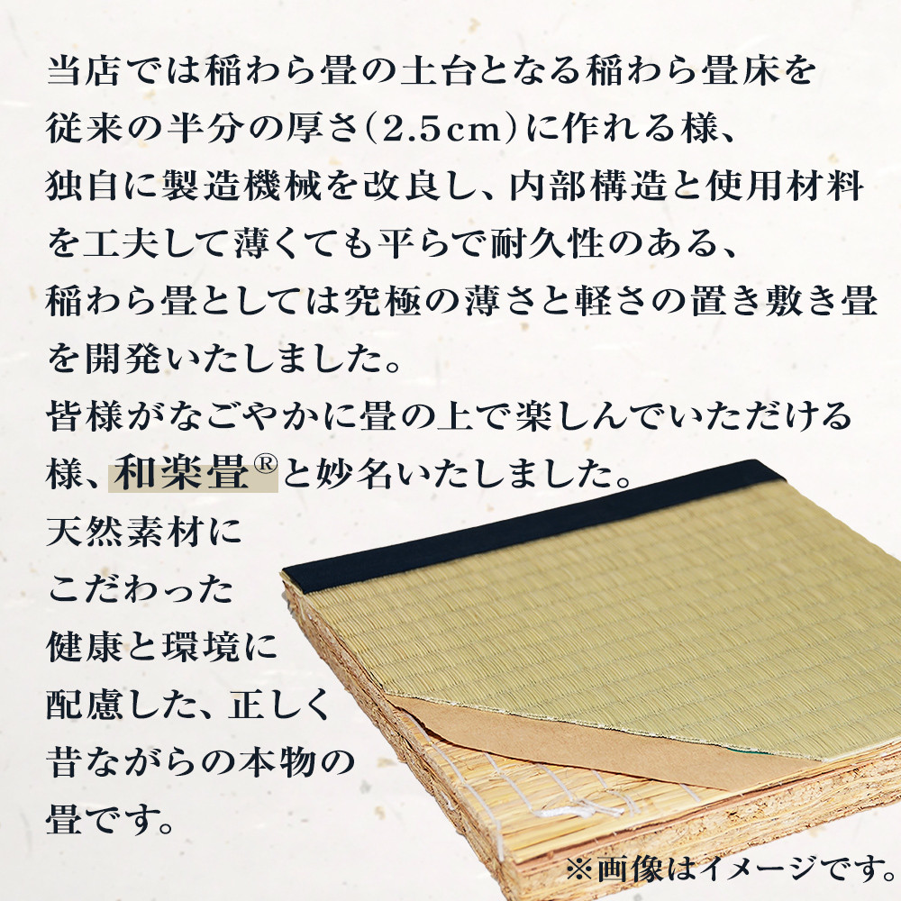 当店では稲わら畳の土台となる稲わら畳床を従来の半分の厚さ(2.5cm)に作れる様独自に製造機械を改良。薄くても平らで耐久性のある、稲わら畳としては究極の薄さと軽さの置き敷き畳を開発いたしました。皆様がなごやかに畳の上で楽しんでいただける様、和楽畳®と妙名いたしました。天然素材にこだわった健康と環境に配慮した、正しく昔ながらの本物の畳です。