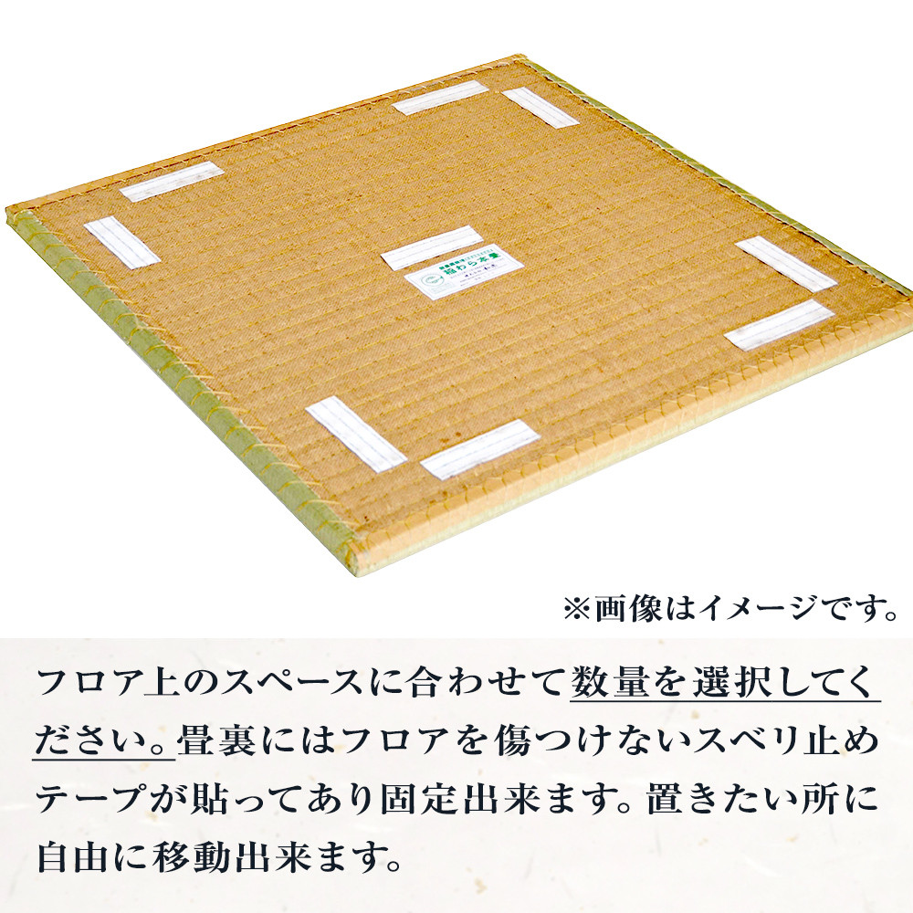 | 容量 | 縁付和楽畳半畳×1枚 (大きさ 約85cm×85cm 厚さ3cm 重さ約7.5kg) ※ご希望のカラー(黒・茶・鉄紺)をお選びいただき、備考欄へご記入ください。 ご記入がない場合は「鉄紺」でお届けいたします。 ※フロア上のスペースに合わせて数量を選択してください。 ※畳裏にはフロアを傷つけないスベリ止めテープが貼ってあり固定出来ます。置きたい所に自由に移動出来ます。 |