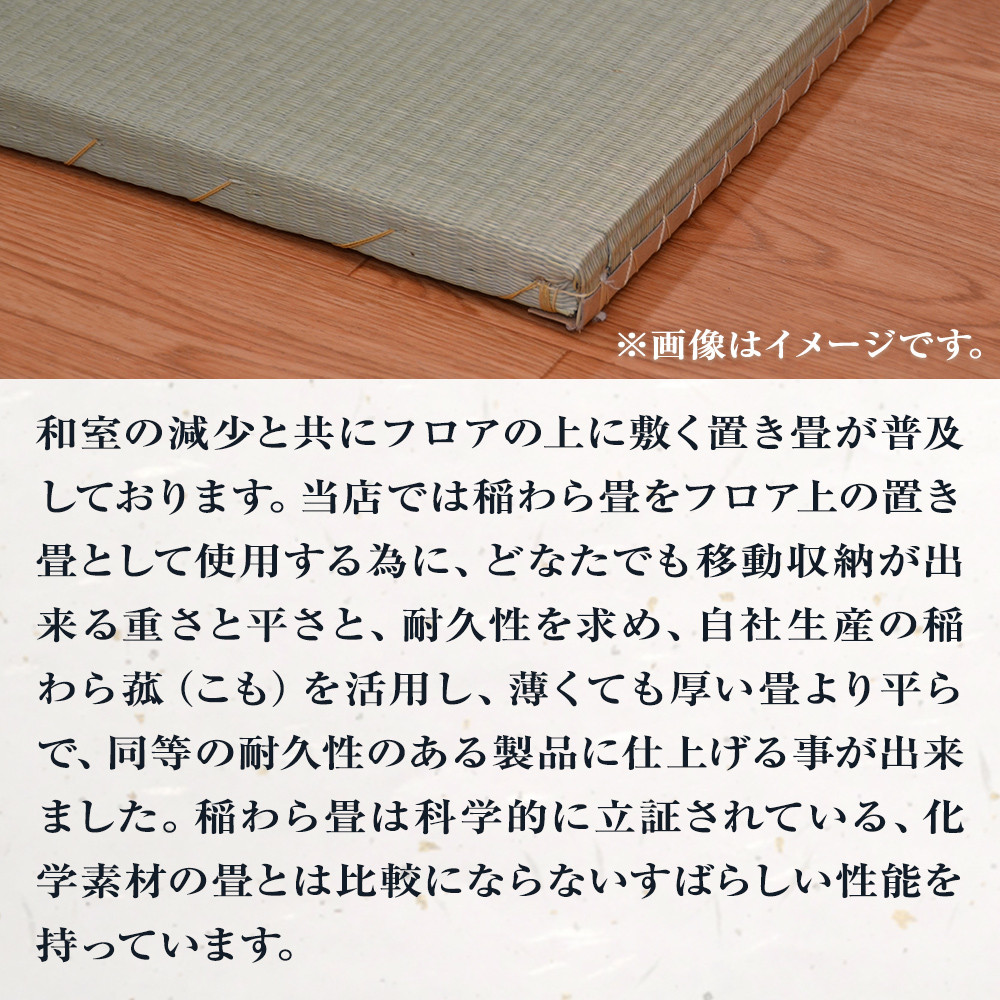 当店では稲わら畳をフロア上の置き畳として使用する為に、どなたでも移動収納が出来る重さと平さ、耐久性を求め、自社生産の稲わら菰(こも)を活用。薄くても厚い畳より平らで、同等の耐久性のある製品に仕上げました。