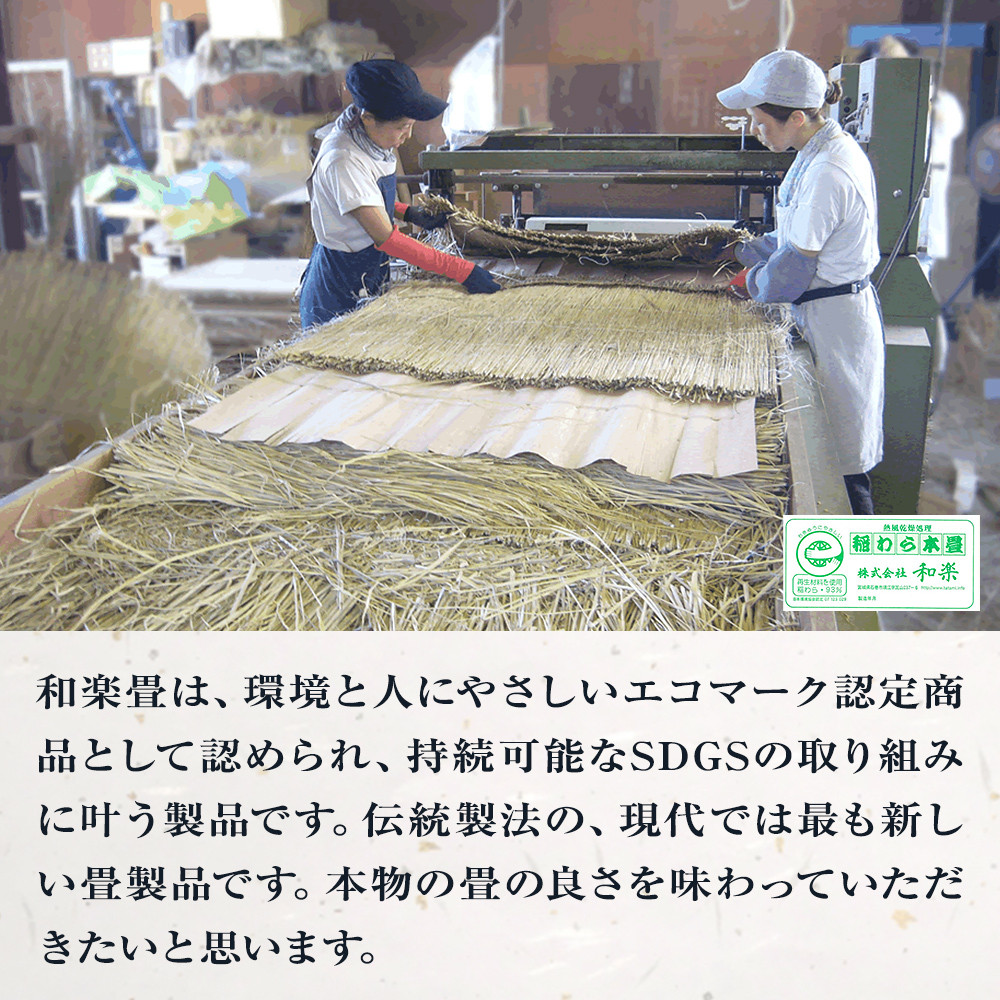 稲わら畳は科学的に立証されているすばらしい性能を持っています。当店の和楽畳は、環境と人にやさしいエコマーク認定商品として認められ、持続可能なSDGSの取り組みに叶う製品です。伝統製法の、現代では最も新しい畳製品です。本物の畳の良さを味わっていただきたいと思います。