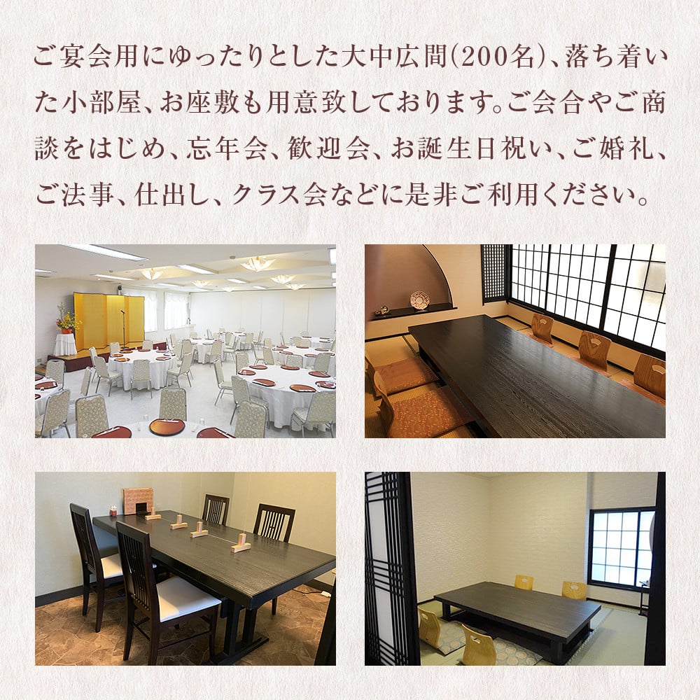 ご宴会用にゆったりとした大中広間(200名)、落ち着いた小部屋、お座敷も用意致しております。ご会合やご商談をはじめ、忘年会、歓迎会、お誕生日祝い、ご婚礼、ご法事、仕出し、クラス会などに是非ご利用ください。