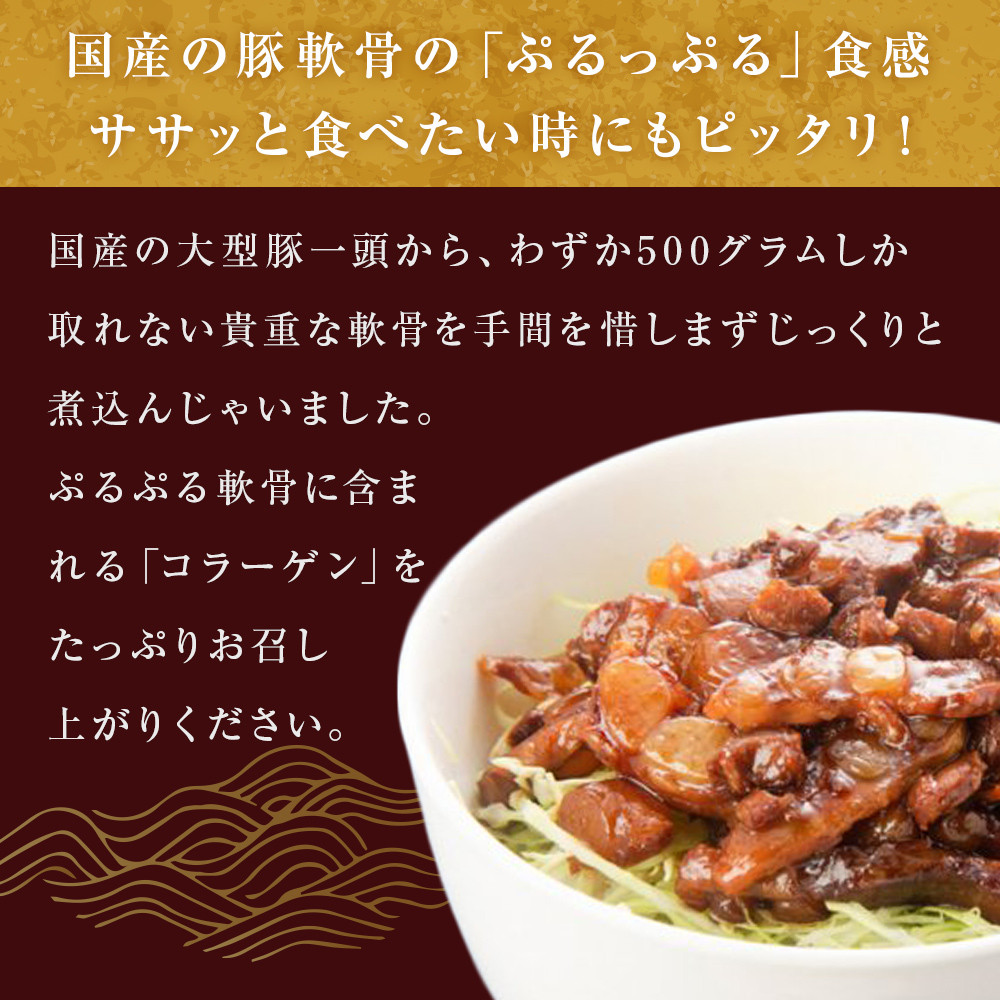 1箱2袋入りで、1袋が一人前ですのでササッと食べたい時にもピッタリです。レトルト加工で賞味期限が365日ありますので、備蓄用としてストックしておいても良い製品です。国産の豚にこだわった軟骨の「ぷるっぷる」の食感をお楽しみください。